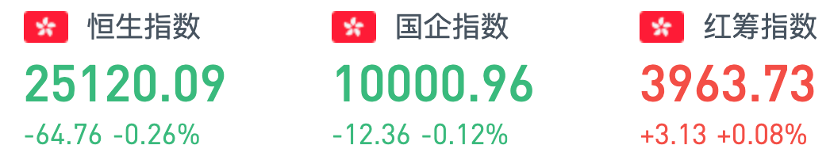 周二,恒生指数收盘下跌64.76点,跌幅为0.26%,报收25120.09点;国企指数收盘下跌12.36点,跌幅为0.12%,报收10000.96点;红筹指数收盘上涨3.13点,涨幅为0.08%,报收3963.73点。