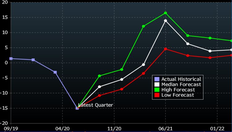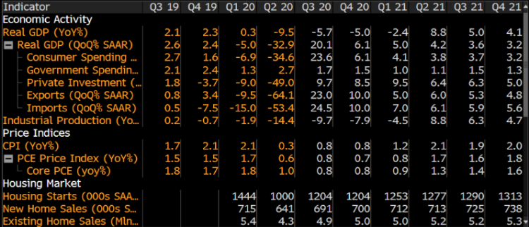 随着美国二次扩散风险逐步控制和企业开工持续,经济增长预期上涨。从全球投行的平均预测来看,3季度美国GDP环比年化增长约20.1%,CPI同比和核心PCE分别回升到0.8%,全年来看,美国2020年GDP仍然为负,2021年1季度美国GDP同比增长可能回到5%。欧洲方面来看,基本上2季度也是欧洲经济GDP和CPI的底部。
