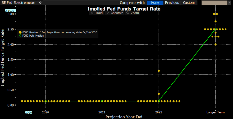 货币政策方面,当前美联储货币政策委员会(FOMC)的联储目标利率矩阵来看,2022年之前,市场还是Price美联储不会选择加息,仍然保持0利率。这里面存在两个风险: