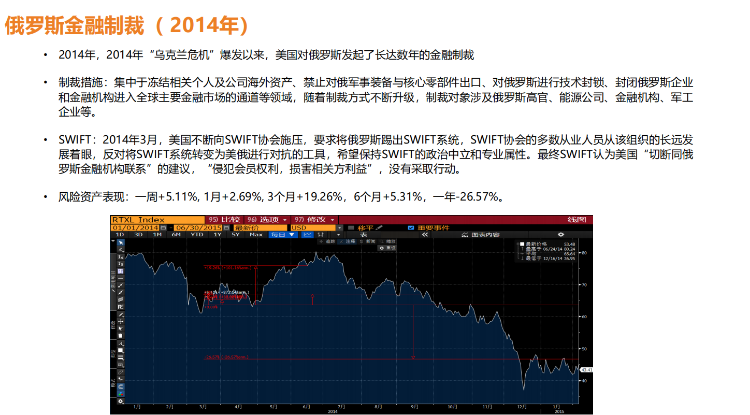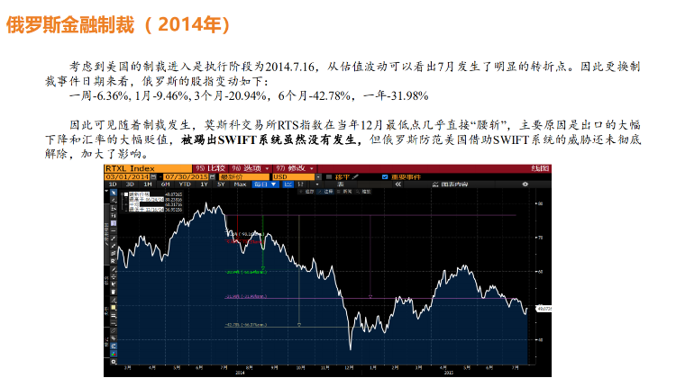 (2)一般随着制裁升级,一开始制裁个人的政策可能不会导致市场大幅下跌,当逐步上升到金融机构,市场可能会出现暴跌。