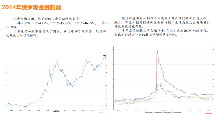 (3)一般随着制裁升级,外汇和股票反应较为剧烈,下跌幅度可能达到50%以上,债券也会跟随下跌。下跌时间可能长达数年。