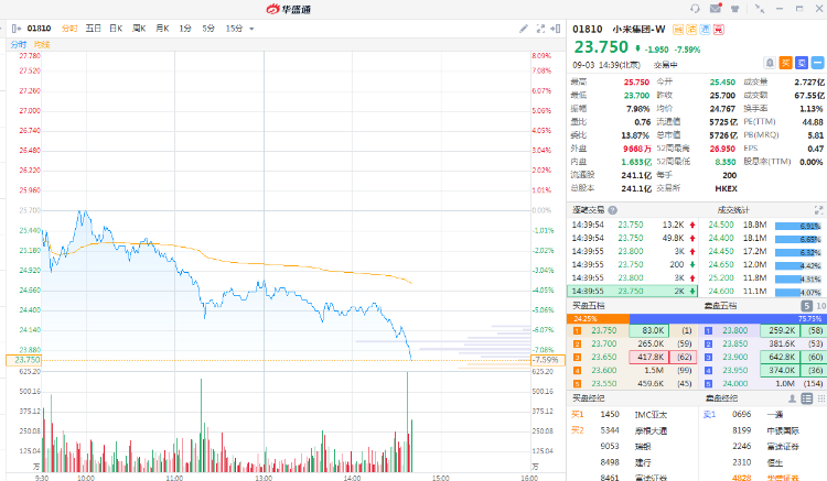 9月3日消息,小米集团午后遭遇重挫,公司股价大跌7%,目前报价23.75港元,市值不足5726亿港元,过去半个月公司股价暴涨77%,近三个交易日内资买入超1亿股。