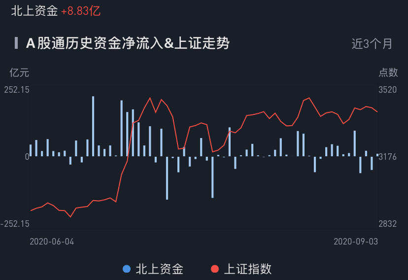 北上资金今日净流入A股8.83亿元,由前一日大幅流出转为小幅流入。