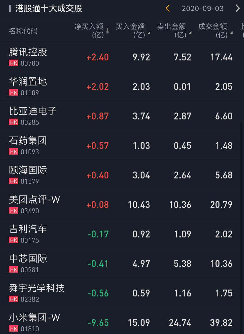 个股方面,今日南下资金净买入腾讯控股2.40亿港元,净买入华润置地2.02亿港元,净买入比亚迪电子0.87亿港元。