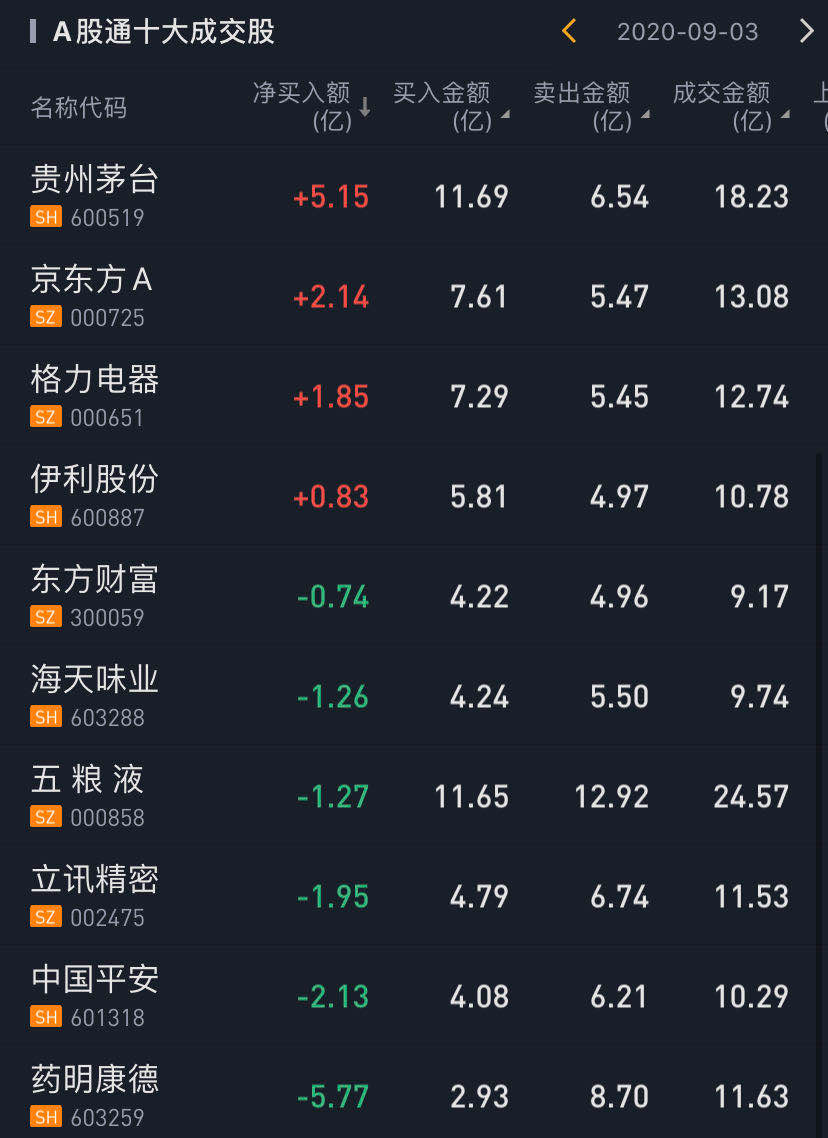 北上资金今日净买入贵州茅台5.15亿元,净买入京东方A2.14亿元,净买入格力电器1.85亿元。