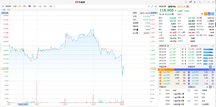 9月3日消息,颐海国际遭执行董事孙胜峰连续两日减持,公司股价连续大跌,今日一度跌超11%,现跌幅收窄至4%,市值1223亿港元。