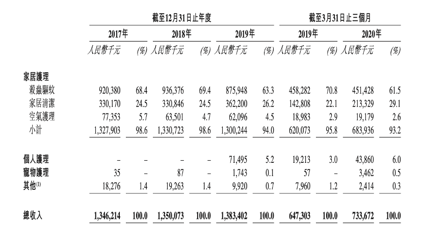 收入结构方面,公司涉及的领域主要包括家居护理(包括驱蚊杀虫、家居清理、空气护理)、个人护理、宠物护理,其中家居护理领域为核心营收来源,2019年营收占比高达95.8%。此外,驱蚊杀虫板块在家居护理领域中占比最重,也是公司营收的核心来源,2017-2019年占比分别为68.4%、69.4%、63.3%。