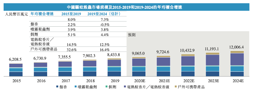 中国杀虫驱蚊是全球最大的杀虫驱蚊市场,其零售额从2015年的人民币62亿元增长至到2019年的人民币84亿元,年均复合增速8.0%,增速远快于全球市场增速3.4%(均按当年人民币计)。