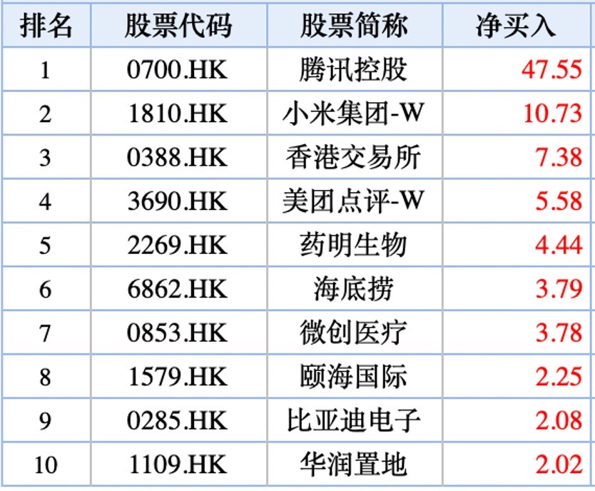个股资金流向统计:南下资金加仓腾讯近50亿港元,买入小米超10亿港元