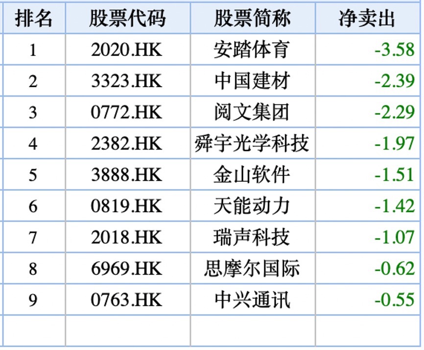 本周,南下资金净卖出安踏体育3.58亿港元,净卖出额排名第一。此外,南下资金还卖出中国建材2.39亿港元,净卖出阅文集团2.29亿港元,净卖出舜宇光学科技1.97亿港元。