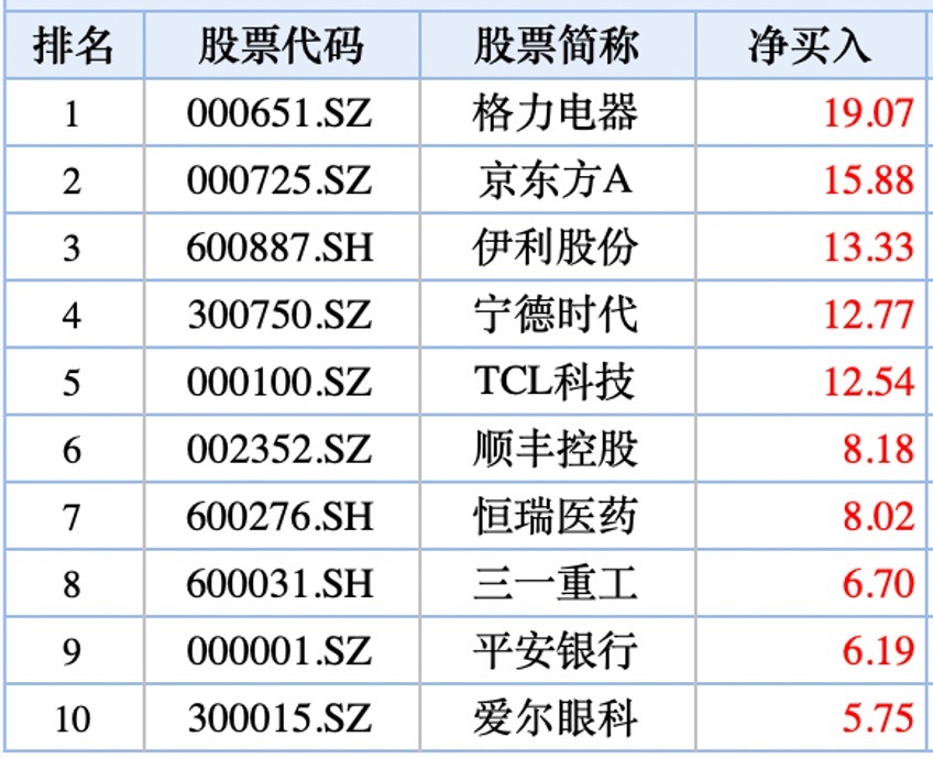 本周北上资金对格力电器、京东方A、伊利股份、宁德时代、TCL科技等个股均加仓超10亿元。其中,格力电器获净买入排名第一,北上资金一周净买入19.07亿元。