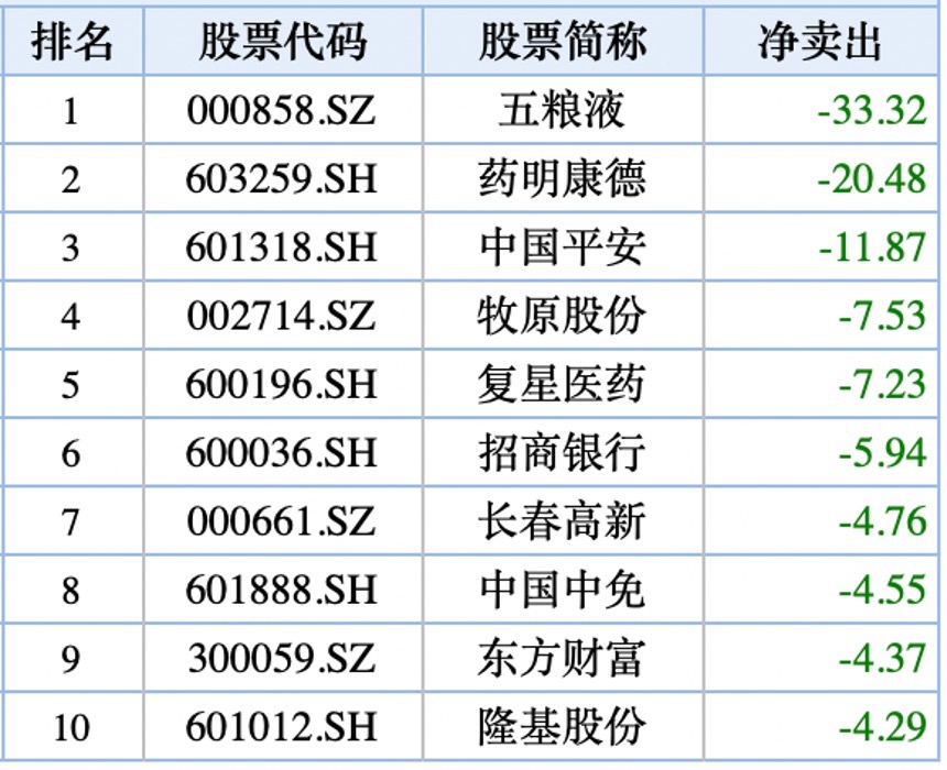 本周北上资金减持最多的标的为五粮液,一周净卖出33.32亿元;净卖出药明康德20.48亿元。此外,北上资金还减持了中国平安,牧原股份、复星医药、招商银行等个股。
