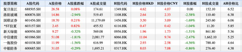 个股方面,复旦张江、洛阳玻璃、国联证券、拉夏贝尔、新天绿能等个股亦存在较大价差,投资者可关注相关个股估值回归机会。