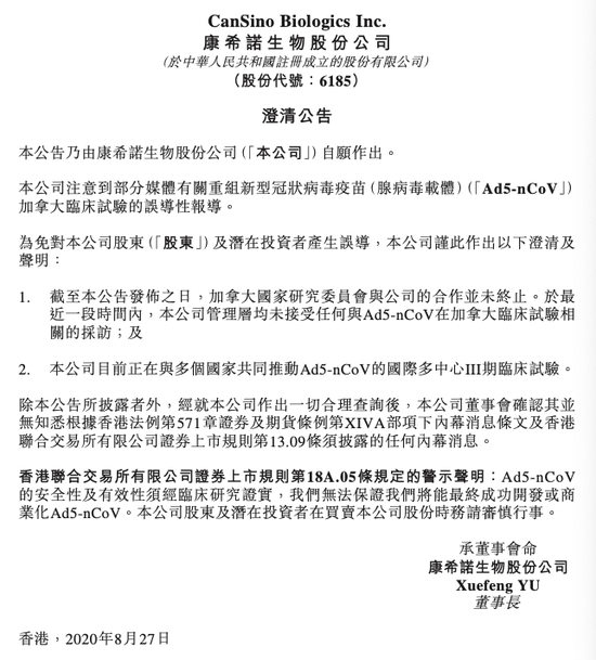 对此,康希诺在8月27日发布公告澄清称,NRC与公司的合作并未终止;且最近一段时间内,公司管理层并未接受任何关于疫苗在加拿大临床试验相关的采访。