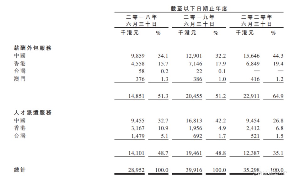 该公司为香港薪酬外包及人才派遣服务供应商,主要向以下几类客户提供服务:(i)中介渠道,即获公司╱机构聘请以为其不同地区的分支办事处处理薪酬及╱或人才派遣相关事宜的全球人力资源服务供应商;及(ii)终端用户,主要包括直接将其薪酬及 ╱ 或人才派遣职能外包予我 们的跨国公司 ╱ 机构。截至2020年6月30日止三个年度(往绩记录期间),公司于中国、香港、台湾及澳门提供薪酬外包服务,并于中国、香港及台湾提供人才派遣服务。公司服务的终端用户可能是 (i) 通过中介渠道聘请我们的间接客户;或(ii)直接客户。