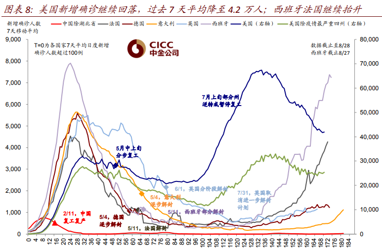 美国疫情的持续改善决定市场风险偏好和风格板块表现,目前来看,美国疫情自 8 月初的高点已经明显回落,过去一周日均新增确诊病例降至 4.2 万人左右,为高点 7 万人左右的六成,死亡人数和阳性率也明显回落,这将有望为未来增长继续修复“续力”,至少先体现在预期之上。