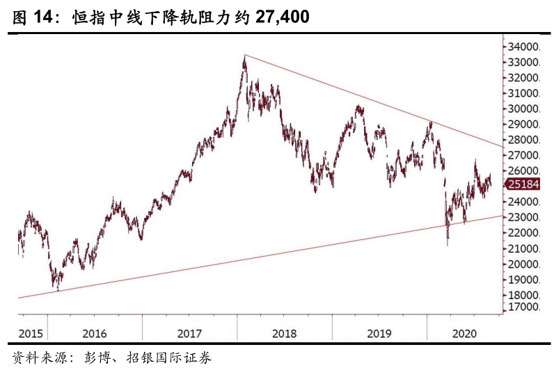 技术面上,恒指由 7 月初至今窄幅波动两个月,估计于 9 月份向上突破的机会较高。年初至今,恒指形成三角形,现已运行至末端,接近突破。结合基本面来看,恒指向上突破机会较大,一旦升穿 250天线阻力约 25,800,下一级目标将会是 7 月初高位 26,782。