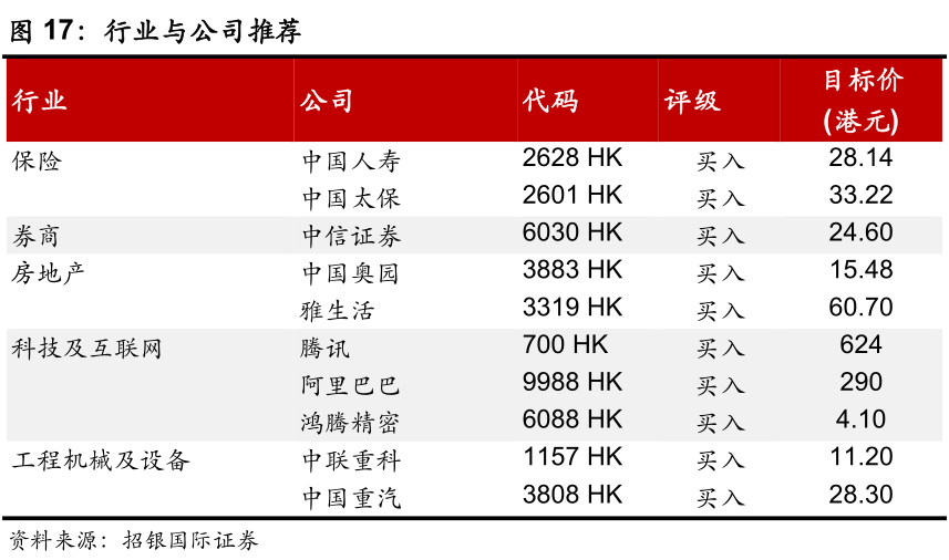 在这些板块,招银国际分别推荐了中国人寿、中国太保、中国奥园、雅生活、腾讯、阿里巴巴、和中联重科等港股。