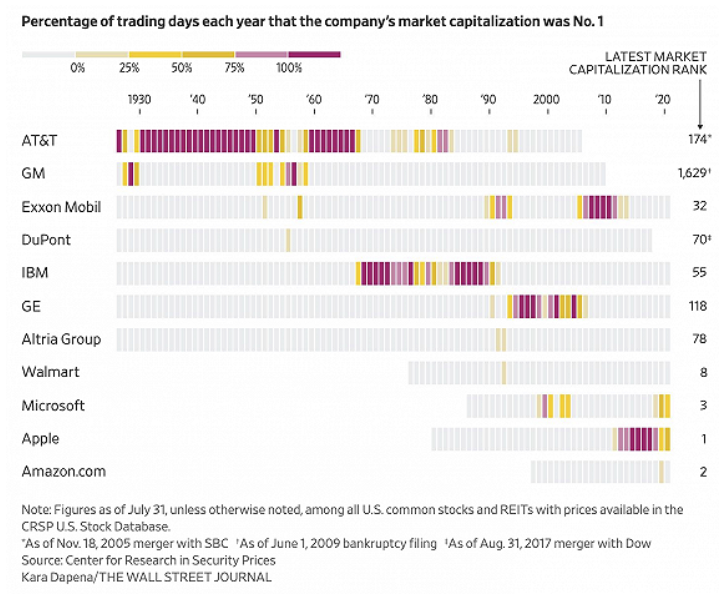 据外媒统计显示,自1925年底以来,按市值排名,只有11家公司曾经在所有美国股票中排名第一,分别是AT&T、通用汽车、埃克森美孚、杜邦、IBM、通用电气、奥驰亚集团、沃尔玛、微软、苹果,以及亚马逊。