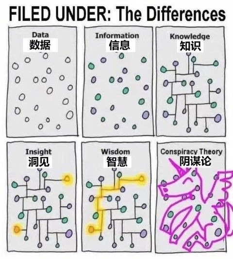 最后提一句,如果连推论和类比都不是牢固的知识,那么大家趋之若鹜、脍炙人口的那些阴谋论,就是毒果中的毒果,是你对世界蒙了心的猪油。下图很能说明这一点。