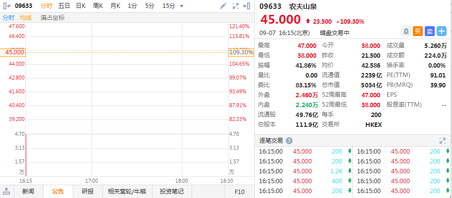 华盛资讯9月7日讯,农夫山泉(09633.HK)暗盘高开76.7%,截至16:16,报价45港元,涨幅109%,一手账面盈利4700港元。最新成交额224万港元,总市值为5034亿港元。