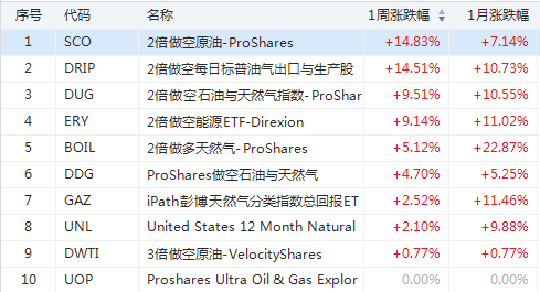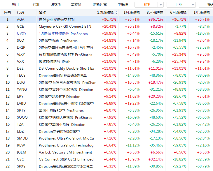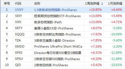 上周全球市场避险情绪陡增,美股ETF涨幅榜基本上是反向ETF的天下。做多恐慌指数、做空原油和油气股、做空美股和港股股指的ETF涨幅排名靠前。