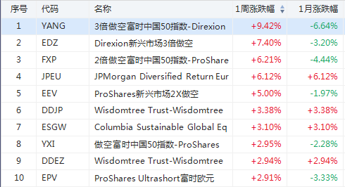 3倍做空富时中国50指数的YANG一周涨幅达到9.42%,富时中国50指数的成分股基本是在香港上市的大型中国企业。