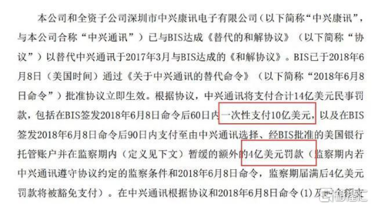 2018年6月,中兴被曝与美商务部达成和解协议,前提是向美国政府支付高达14亿美元的巨额“民事罚款”,其中包括一次性支付的10亿美元——几近中兴过去4年的利润总和!