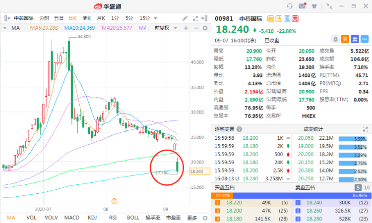 9月7日,中芯国际港股低开15.22%,跌幅曾一度达到20%以上。截至当天收盘,公司市值已下跌22.9%,股价报18.24港元。