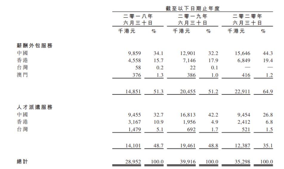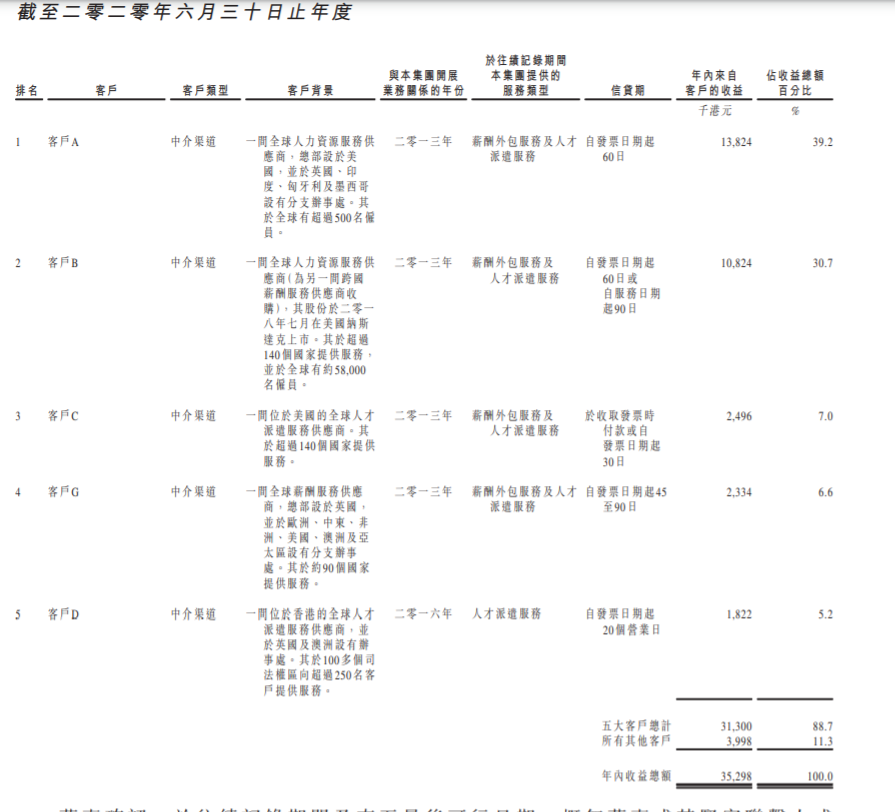 该公司为香港薪酬外包及人才派遣服务供应商,主要向以下几类客户提供服务:(i)中介渠道,即获公司╱机构聘请以为其不同地区的分支办事处处理薪酬及╱或人才派遣相关事宜的全球人力资源服务供应商;及(ii)终端用户,主要包括直接将其薪酬及 ╱ 或人才派遣职能外包予我 们的跨国公司 ╱ 机构。截至2020年6月30日止叁个年度(往绩记录期间),公司于中国、香港、台湾及澳门提供薪酬外包服务,并于中国、香港及台湾提供人才派遣服务。公司服务的终端用户可能是 (i) 通过中介渠道聘请我们的间接客户;或(ii)直接客户。