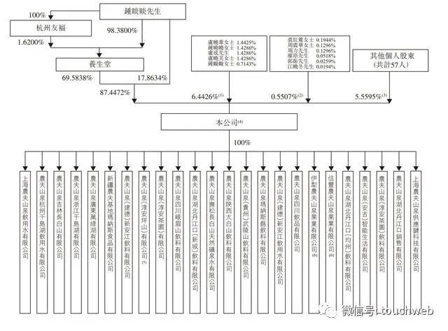 IPO前,养生堂持有农夫山泉69.58%股权,钟睒睒直接持股17.8634%,钟睒睒直接和间接控制农夫山泉87.4472%股权。农夫山泉旗下有众多子公司。