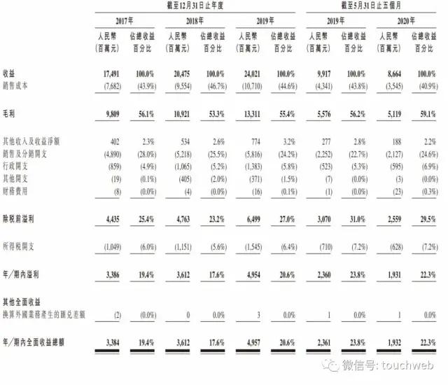 招股书显示,农夫山泉2017年、2018年、2019年期内利润分别为33.86亿元、36.12亿元、49.54亿元,净利润率分别为19.4%、17.6%、20.6%。