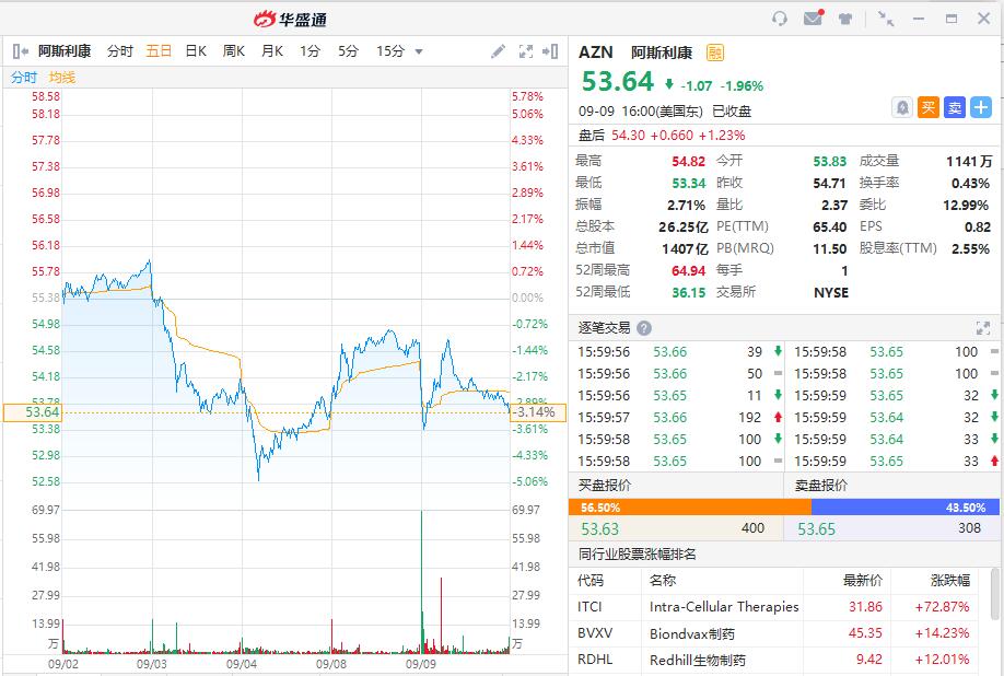 一度跌逾2%的阿斯利康盘中短线拉升翻红,后迅速回落,收盘报53.64美元,收跌1.96%,最新总市值1407亿美元。