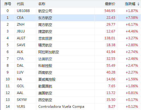 其它美股航空股中,南方航空涨6.17%,捷蓝航空涨4.46%,达美航空涨2.46%。