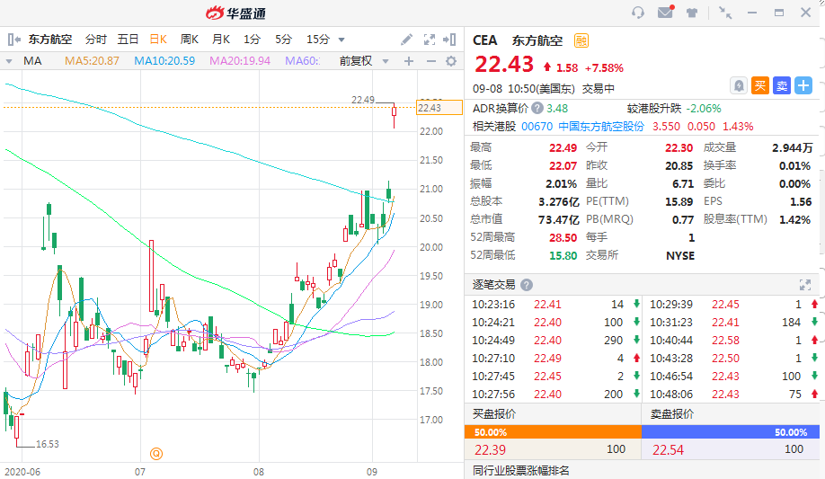 华盛资讯9月8日消息,美股航空股今日逆市上涨,其中,在美上市的东方航空高开高走,截至北京时间22:50,该股涨7.58%,报22.43美元。