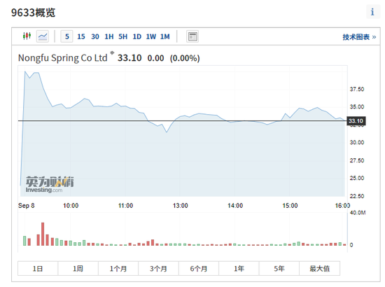 中国最大的瓶装水龙头公司农夫山泉(HK:9633)周二在香港挂牌上市首日飙升85%,该股开盘飙升至每股39.80港元,随后收盘回落至33.10港元,全天上涨37.92%。此前,公司的首次公开募股价格是21.50美元。