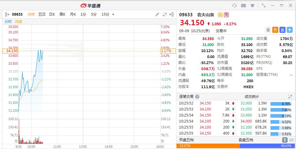 昨日农夫山泉首挂高开超85%,不过随后涨幅收窄,截至收盘涨54.88%。