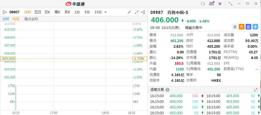 华盛资讯9月9日,“餐饮巨无霸”百胜中国(09987.HK)暗盘低开,截至16:16跌1.46%,报价406港元,成交额50.4万港元,最新市值1701亿港元,百胜中国(YUMC)美股盘前跌0.61%。