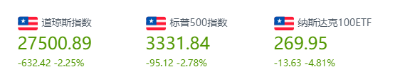 美股周二复市后即裂口急挫,延续上周五跌势,道指全日低位横行,截至收盘,道指收跌2.25%,报27500.89点;纳指收跌4.11%,收盘失守11000点关口;标普500指数跌2.78%,报3331.84点。