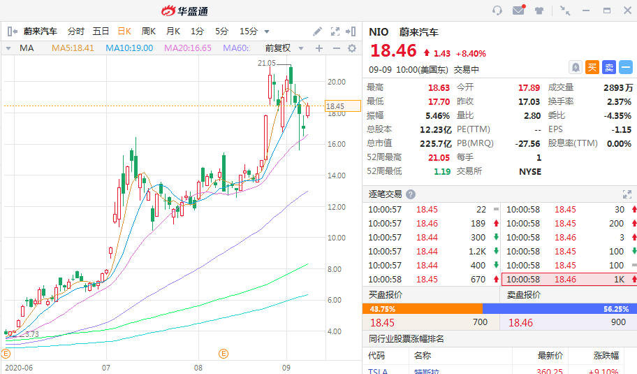 华盛资讯9月9日消息,美股盘初新能源汽车股普涨,其中蔚来汽车高开高走现涨超8%,报18.46美元。