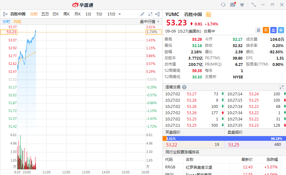 华盛资讯9月9日消息,连跌4天后,百胜中国今日止跌反弹,截至发稿,该股现涨1.74%,报53.23美元。