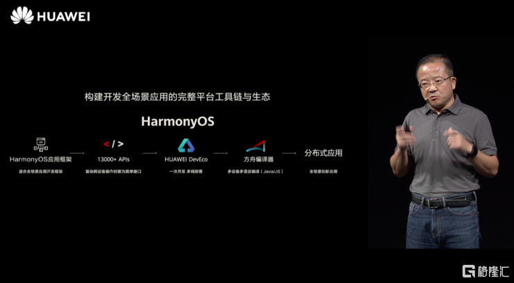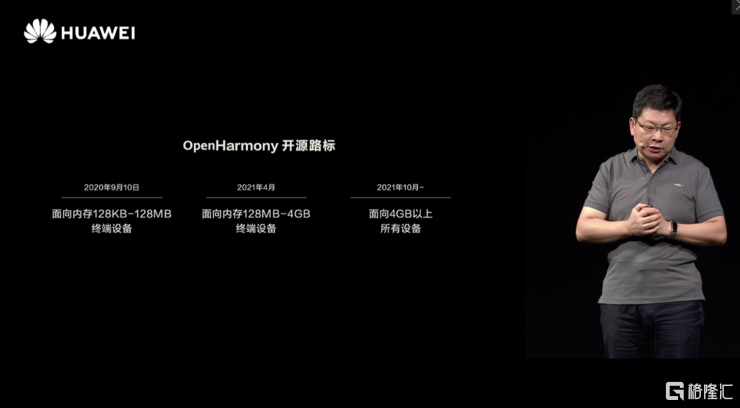 余承东在演讲中表示华为将代码捐赠给中国开放原子开源基金会,并宣布了 HarmonyOS 的开源路标: