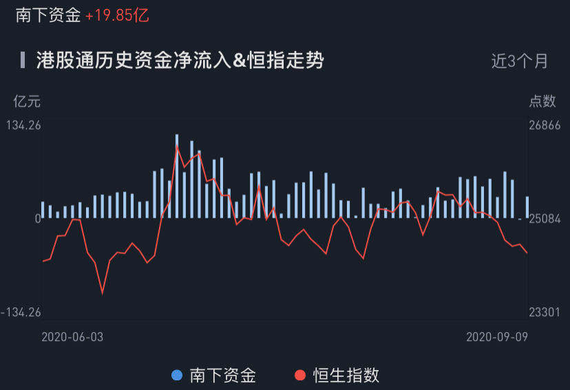 南下资金今日净流入港股19.85亿港元,较上一交易日流入有所减少。