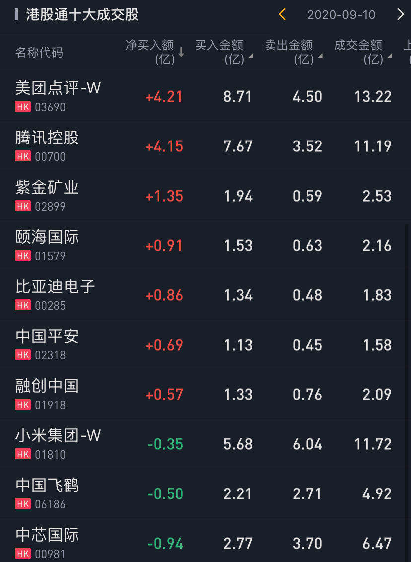 个股方面,今日南下资金净买入美团点评4.21亿港元,净买入腾讯控股4.15亿港元,净买入紫金矿业1.35亿港元。
