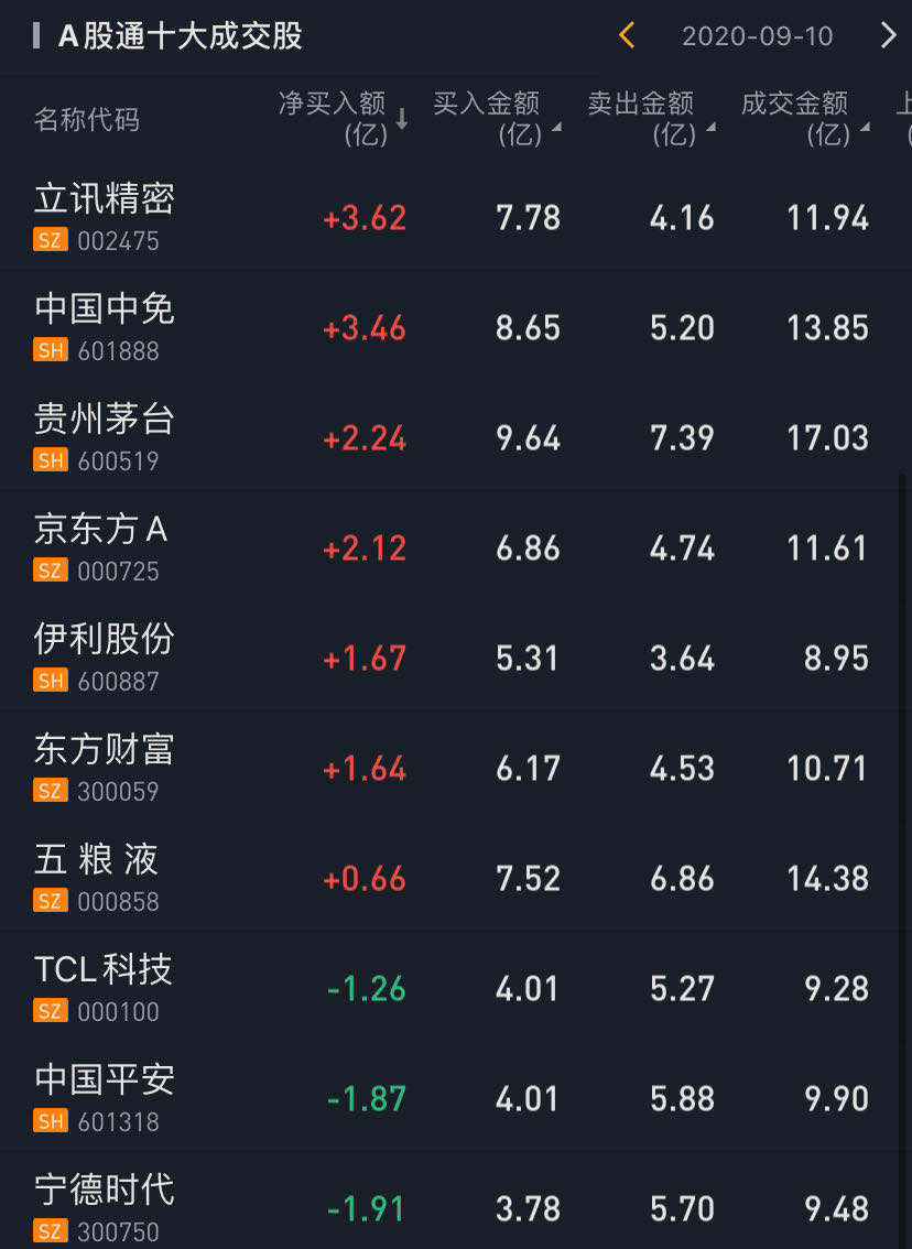北上资金今日净买入立讯精密3.62亿元,净买入中国中免3.46亿元,净买入贵州茅台2.24亿元。