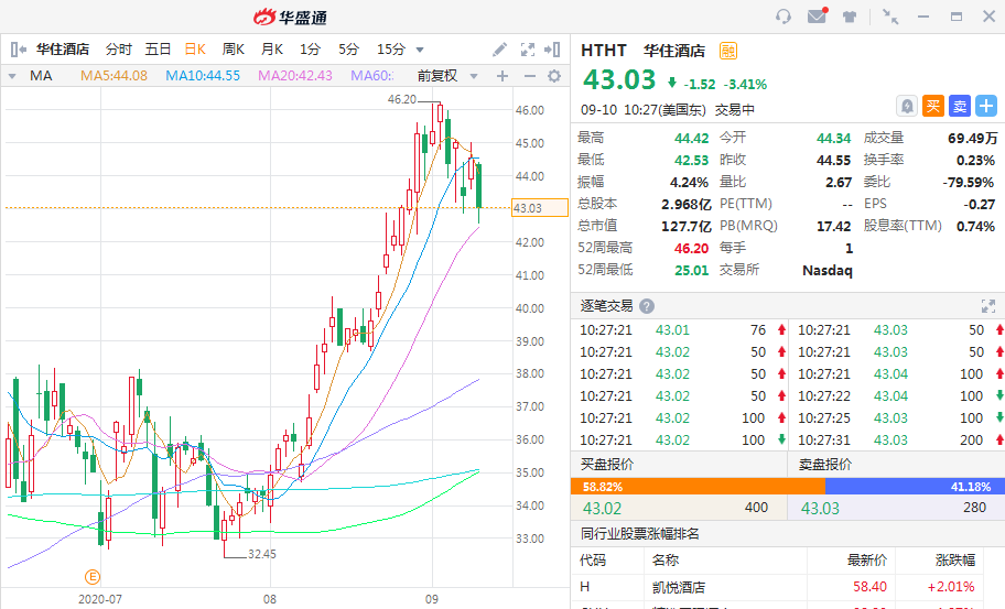 华盛资讯9月10日消息,美股盘初华住酒店股价下跌,截至发稿跌3.41%,报43.03美元。