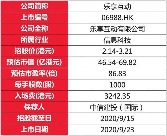 据悉,乐享互动于9月10日-15日招股,公司拟发行5.437亿股股份,公开发售占10%,国际配售占90%,另有15%超额配股权。每股发售价2.14-3.21港元,每手1000股,入场费为3242.35港元,预期将于9月23日上市。