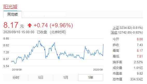 值得一提的是,阳光城股价已迎来两连涨。9月9日,阳光城股价突然大幅上涨,开盘报6.78元/股,下午开盘即封上涨停板,最终报7.43元/股;9月10日开盘又迎来一字涨停,股价报8.17元/股。