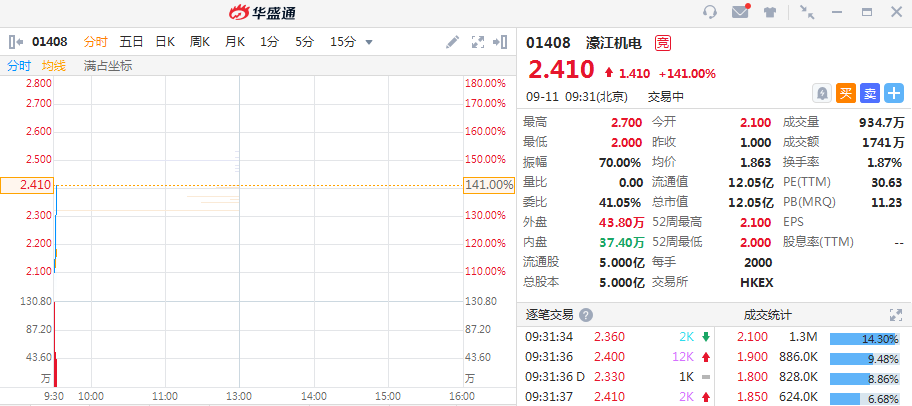 华盛资讯9月11日讯,濠江机电(01408)今日挂牌,开盘涨110%,盘前成交额1523万,截至9:32报价2.41港元,涨幅141%,总市值12.05亿港元,一手收益近三千港币。昨日该股暗盘收报1.85港元,较招股价1港元涨85%。每手2000股,不计手续费,每手赚1700港元。