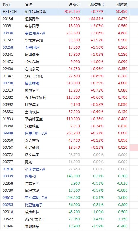 恒生科技指数今日微涨0.64%,恒腾网络涨33%领涨指数成分股,恒腾网络9月7日被上交所剔除港股通。